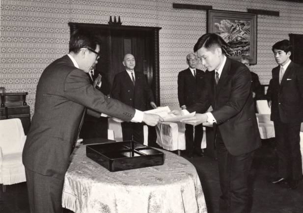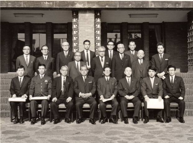 左は 坂田文部大臣 総理官邸前庭にて